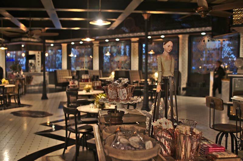 The Butchery on Main, Ally and Ivy's place of business, carries this design theme onward. A mixture of glossy surfaces is broken up between subway tile, marble floors, black and white palette, and an intoxicating mix of leather and wood. Accenting pieces of hammered copper jump out. The entire space is hemmed in by windows covered with deco inspired cutouts that serve to give the feel of a prison. It's all quite elegant, but again, it's also unsettling. The product tables feature Voluspa, a favorite of Claire's. Fresh flowers come weekly from My Secret Garden. One of the standout moments of the set is a fan-like grouping of 3 overscale copper sconces. They were sourced from Universal Property and play as a single piece. I couldn't take my eyes off of them.