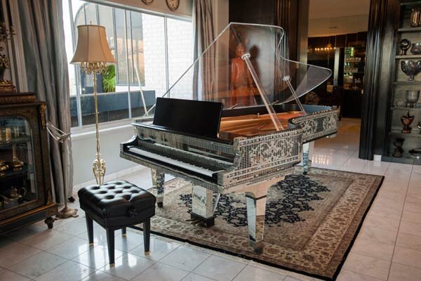 “Liberace had an exclusive deal with Baldwin regarding pianos,” reveals Munch Cameron. “He never had to buy one! We discovered that Baldwin Piano is now owned by Gibson Guitar. The mirrored glass grand piano that Liberace had in his penthouse currently resides in the Gibson showroom at their corporate offices in Beverly Hills. They loaned us the piano, which we had to have hoisted by crane up to the penthouse, and which we were later able to send to Las Vegas to pair with a matching one (of course!) that he had used in a dueling piano scene on stage.”