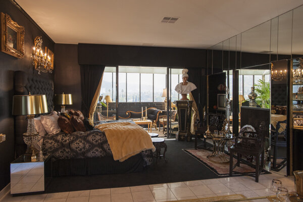 “I just had to have Liberace’s eyelash sofas for the living room, which Omega made for us. He loved draperies and upholstery, along with mirrors and crystal, but his taste was ridiculous…he would take a $40,000 chandelier and spray-paint it gold! We think he had somebody do the penthouse, it actually had some taste…”