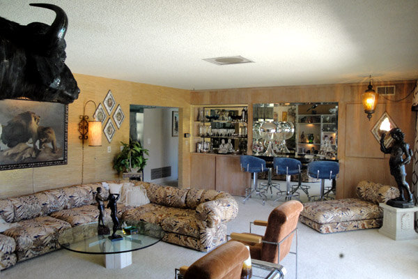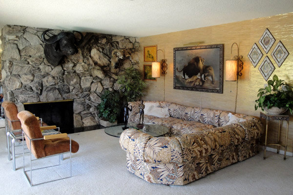 “Liberace owned many other homes,” says Cummings. “He didn’t invest in stocks, but he bought houses, often for other people. He fixed up ramshackle places, and he shopped and shopped, filling them up with stuff.” He bought a house in Las Vegas for Scott Thorson, as an insurance should anything happen to the significantly older Liberace, who even pursued the idea of adopting the younger man. This house had a more masculine style, with nods to Thorson’s experience as an animal handler and intent to become a veterinarian. In the film’s re-creation, a none-too-subtle water buffalo’s head punctuates a rugged stone fireplace wall, contemporary furnishings are mixed with the usual kitsch.