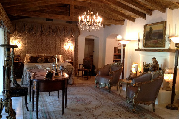 The ceiling of the master suite was painted as homage to the Sistine Chapel, the bathroom an homage to himself…a painting of his head floats among keyboards and cherubim on the bathroom ceiling. Marble Grecian columns flank the stepped marble tub. There was much press during Cannes re: the tub, not always accurate. Munch Cameron clarifies, “Libby found the guy whose father made that tub for Liberace…the son still has the company. He said, ‘I have the recipe and the drawings, so I’ll just make the whole thing, with the columns and everything’…and he did!”