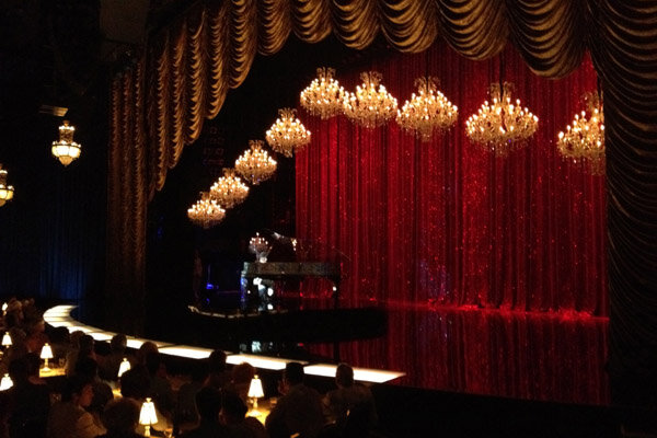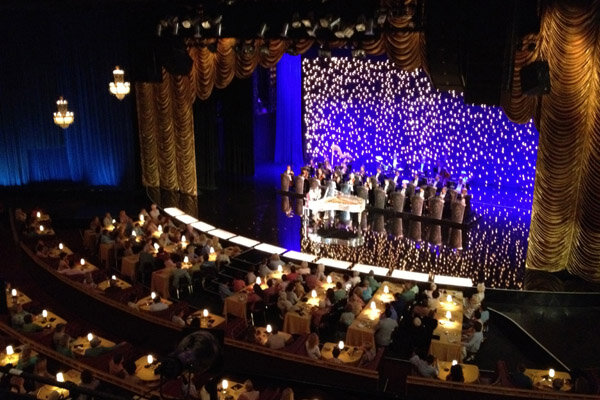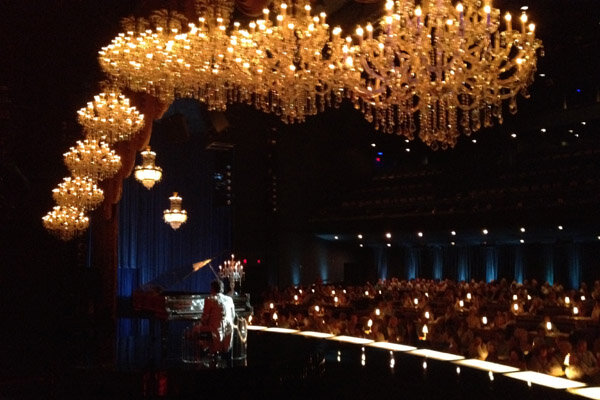 “The stages were a big deal,” she acknowledges, “…the chandeliers, pianos, candelabras, obviously…but also, the stage curtains! We had Dazian make a $17,000 Austrian curtain, which weighed 400 pounds and served as the backdrop for his piano. Thankfully, we were able to sell it back to Dazian when we wrapped! In the theater house, we took all of the stadium seating out and had the shop at Sony build 16 booths to match the 8 that we got from Omega.”