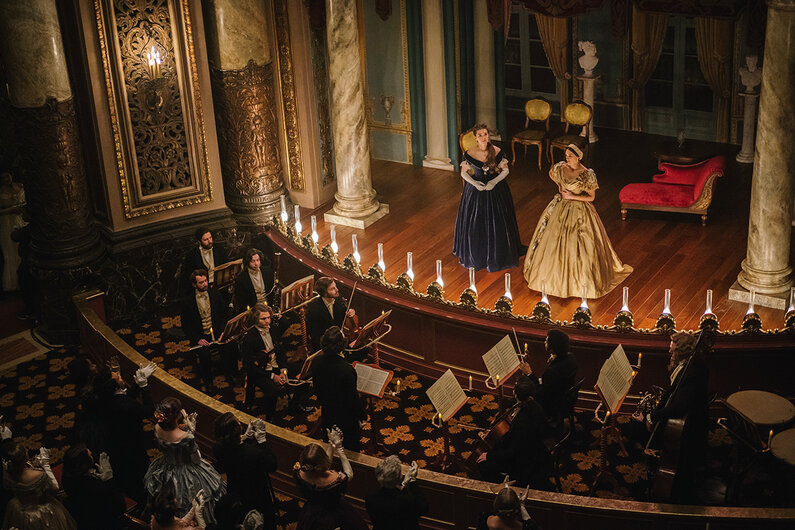 The Homestead, Emily's home, which had been a spectacle in Season 1, became more austere and calmer in Season 2, to contrast with the materialism and maximalism of The Evergreens. That contrast deepened in Season 3, as the story played out in the long shadow of the Civil War. The stories struck out into the wider world more often in Seasons 2 and 3, expanding their world: a visit to the opera, salons and parties, the printing floor of the Springfield Republican, a cattle show at the county fair, and a large quilting bazaar to raise money for the war effort.