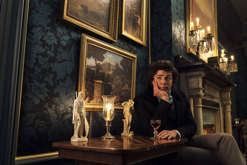 The Evergreens parlor: A humble, ragtag sofa which, after reupholstery, became the centerpiece of the Evergreens parlor. Ingrain wall-to-wall carpeting was woven for us by Family Heirloom Weavers. Finn Jones as Samuel Bowles. Image courtesy of Apple..