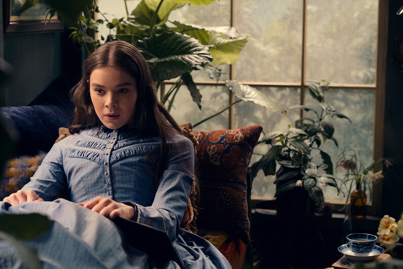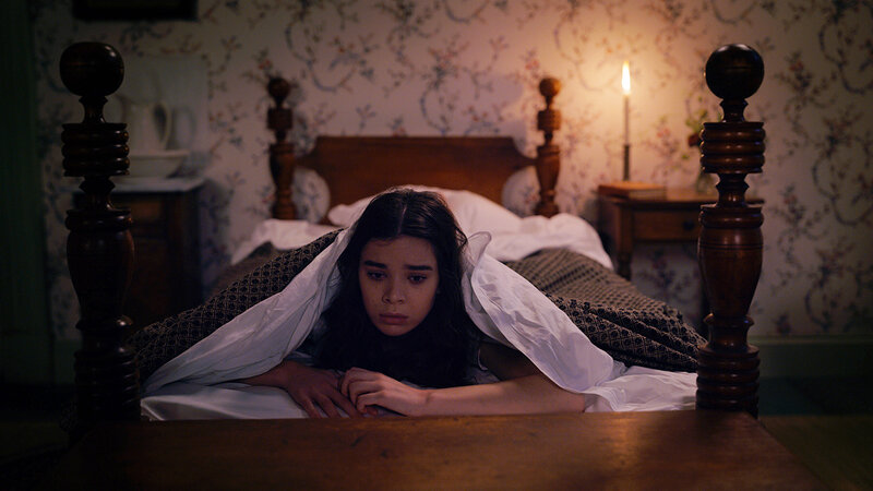 Emily’s bedroom set: A montage at the end of Season 3. Our stage set was the same scale and layout as her real bedroom. The wallpaper is a Thomas Strahan pattern from the 1850s,"New England Floral." Hailee Steinfeld as Emily. Image courtesy of Apple.