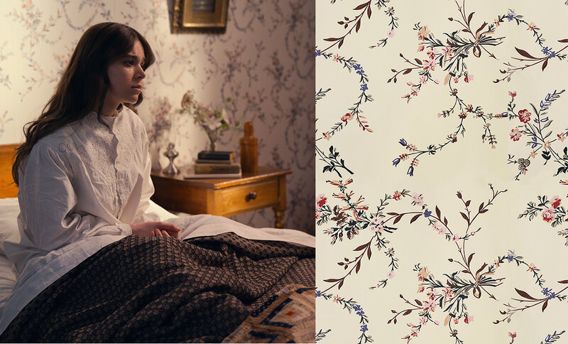 Emily Dickinson lived in that bedroom her whole life, and later in life rarely left it, speaking with visitors through the closed door. DICKINSON is about Emily in her 20s, a freer-spirited time in her life. I decided to use "New England Floral" wallpaper for our bedroom set. The pattern is from Thomas Strahan’s historic collection, dating to the 1850s. It's a youthful pattern that feels like a wallpaper her parents might have put up for her. It is light and lyrical, and has enough negative space to breathe.