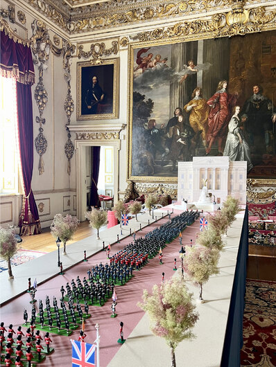 The Queen’s Funeral Parade mock-up, in which the Queen, Herself, took part in the planning years before. Set Decorator Alison Harvey SDSA embraced the task of finding tin soldiers from all over the world, and eventually 3-D printing some, so she and her team could accurately portray each regiment as would appear in the future procession. Alison gives fascinating details in the video conversion above.