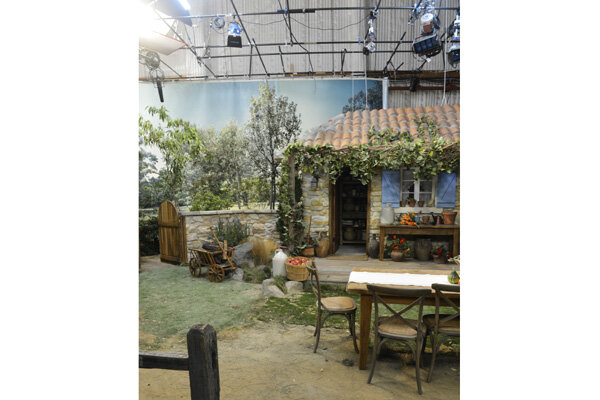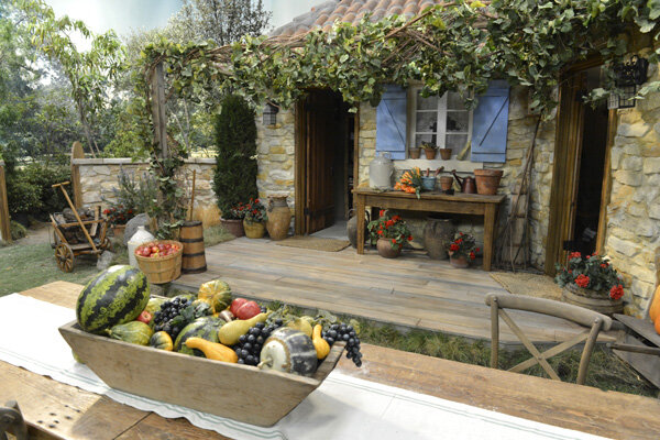 “So we pulled photographs from WIZARD OF OZ, because of the pigpen, and from CHOCOLAT, because of the farm table outside…and some from the south of France, because, well…duh…we did more research and found several other inspiring photographs…and then I used my farming background and selected some ancient farm tools and old carts, and ordered some fruit and firewood. There were things that we wanted to include in this set, but couldn’t, like lavender and some citrus trees. Lavender is not very pretty in February and the citrus trees are quarantined, so we couldn’t move the citrus trees from the valley to the studio…You will note, there are no citrus trees.”