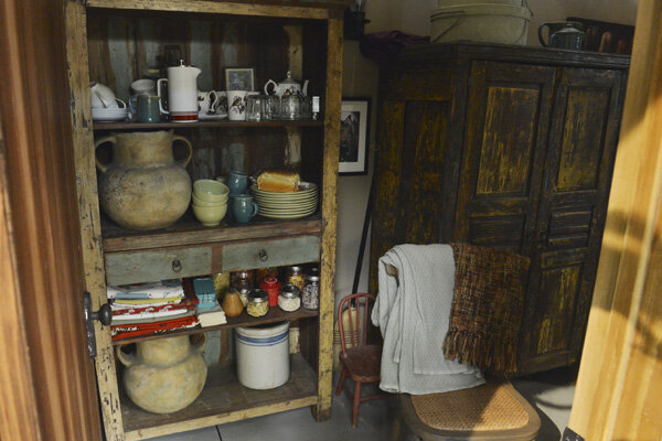 “There are things here I wanted to show. The working farm implements, for example, and textiles…and a real spice shelf…my cousin was cleaning out her spice cabinet and sent me all the old-style cans! That was such a gift. People don’t know…”