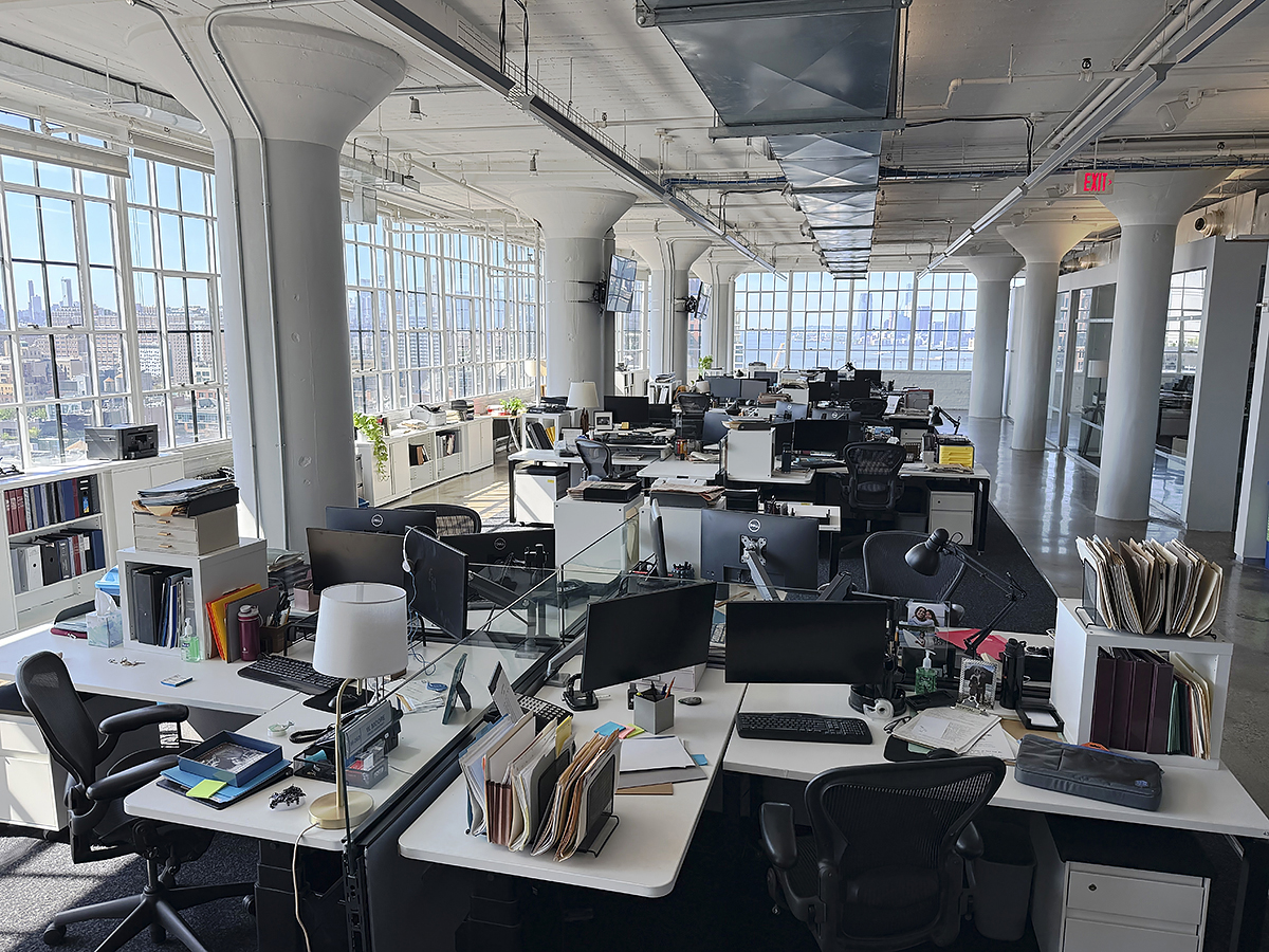 The Financial Register, reverse. Isabel’s desk is at the far end, with two actual walls of windows, shot on location at the iconic Starrett Lehigh Building in Chelsea, NYC. The editor’s office is the glassed-in room on the right. Photo: Greg Leshé Studio.