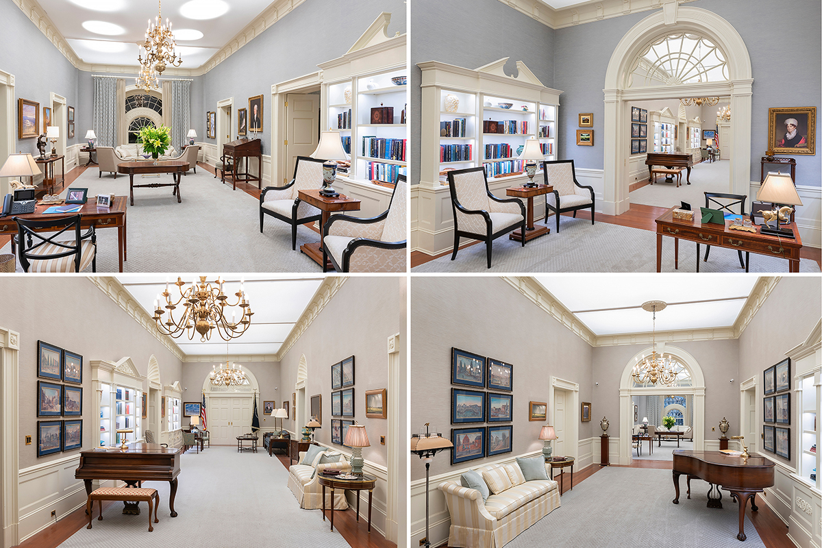 White House Residence. Above, L/R: West Sitting Hall; West Sitting Hall looking towards Center Hall. Below, L/R: Center Hall looking towards East Sitting Hall; Center Hall looking towards West Sitting Hall. Photos: Greg Leshé Studio.