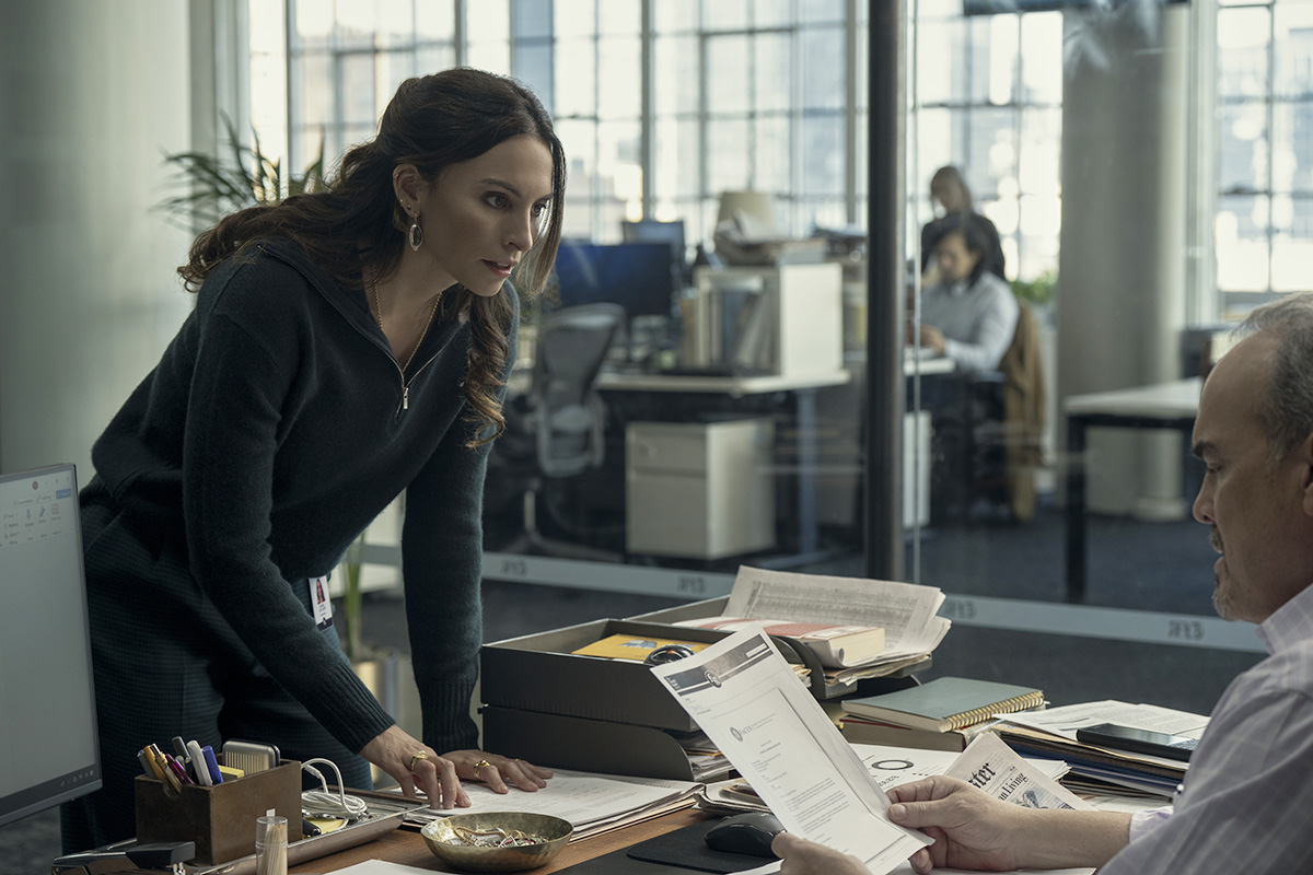 Editor Mike Fonseca’s office. Brilliant analyst Jay Batra [Suraj Sharma] is in danger having uncovered suspicious financial activity linked to terrorism. On the run, he and Isabel De Leon [Genesis Rodriguez], equally brilliant financial journalist, track research Mike had been doing when he was killed by an assassin, and try to find the encryption that will break the code on the Monroe Drive. Watch this season to find out what we mean! Courtesy of Netflix © 2026.
