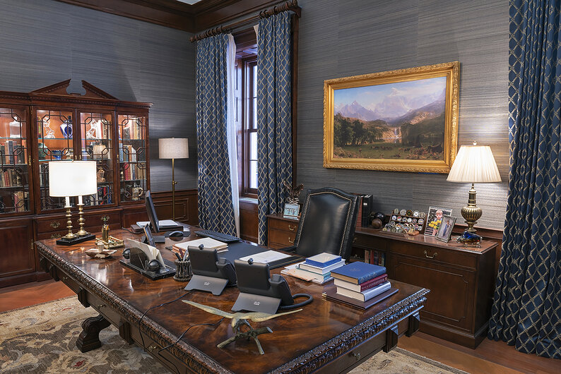 Both first ladies styles were similar because of their elegance, but Laura Bush’s taste was more traditional while Michelle Obama brought more modern pieces and art into the residence. We decided to bring in more western art to reflect the Hagans’ home state of Kansas. For the art, I drew inspiration from my mother in law, whose career focused on selling western art in both Wyoming and Arizona.”