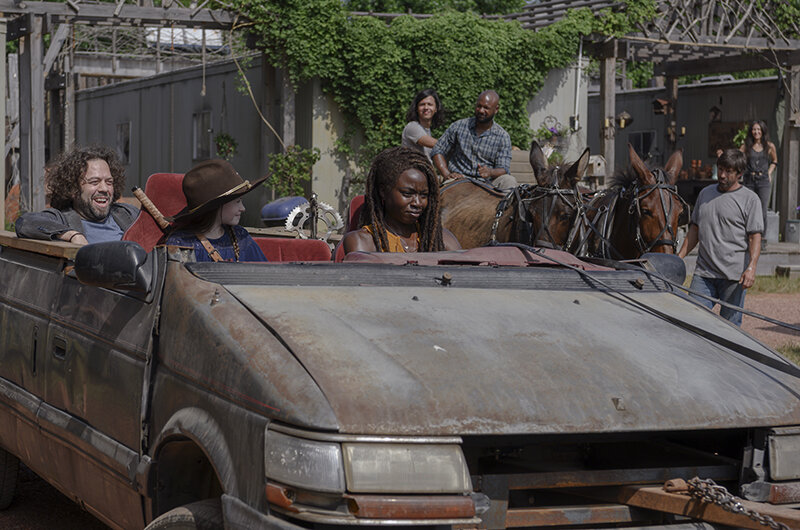 Season 9 presented a reset, with the story entering a period of tenuous peace among the various survivor communities followed by a six-year time jump after star Andrew Lincoln’s departure. [He had played the series protagonist Rick Grimes.] The time jump in the middle of the season presented its own logistical challenges, requiring an entirely new visual aesthetic in about a week. Grosso and her team had accumulated materials...recycled fabrics, rough-sawn wood, handmade items...throughout production on the first five episodes of the season and worked quickly to update the existing sets to show the passage of time. Ironically, that included replacing cars with horse-drawn carriages, as fuel has become an even more scarce resource this far into the zombie apocalypse, and establishing a pioneer-era aspect, which Grosso and Schoen dubbed “Medieval Amish.”