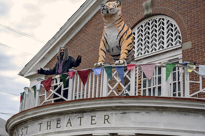 She took this opportunity to transform the typically bland barracks of the Kingdom exterior into a lively celebration that incorporated the aesthetics from each community. Inspired by Tibetan and Mexican pennant flag strings, Grosso and Schoen had flags made out of multicolored recycled fabrics tied to rope, then strung over the gardens. They brought in horse-drawn carriages and created an old-fashioned dunk tank, plus booths filled with art, homemade crafts, candy apples and, fittingly for THE WALKING DEAD, weapons. The Hilltop community was represented with a moonshine station, while Kingdom was emblemized by a 9-foot fiberglass & paper mâché tiger. Bringing the Kingdom interior tapestries outside enhanced the handcrafted atmosphere.