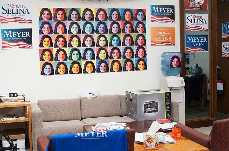Jim really wanted to show how city campaign offices show their enthusiasm for candidates and made up the Warhol-inspired art. We did a wall-sized calendar to show how volunteers sign up for their assignments. We also wanted to show how chaotic these offices are with the use of power strips and Internet cords everywhere.