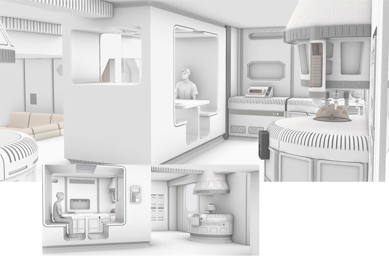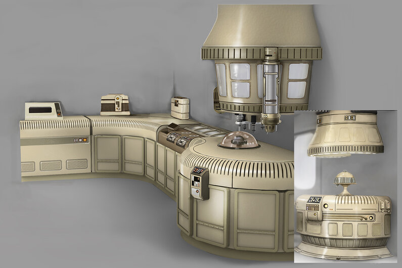 Eedy’s apartment was highly concepted. Set in middle Coruscant and purchased thirty years ago, it had a faded and slightly retro style, with the notion of the city having grown up around it. I completed most of the 3d Modelling and Set Dec concept work over lockdown. Inspiration was drawn from Ralph McQuarrie and the fantastic character of Eedy Karn.”