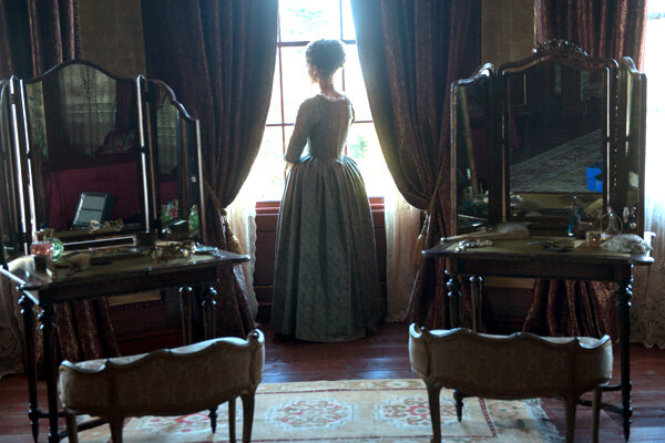 Asante: They did. We shot in 3 different houses in London to create Kenwood House, and then a fourth joined to create the house in Bloomsbury, the London townhouse. The brief that I gave them was that I wanted the early period of the girls’ lives, when they were still relatively young and innocent at Kenwood House, to be pretty much ice cream colors, pastels…gentle blues, baby pinks, very pale…literally ice colors. We wanted their world to have high ceilings, to be big rooms in which the girls seemed even smaller, so that the girls felt almost like dolls in a dollhouse.