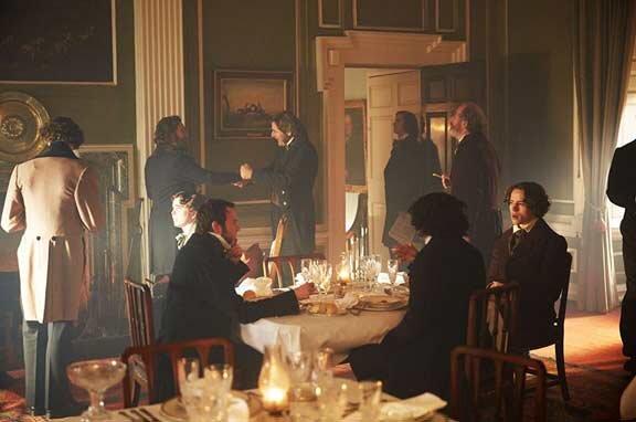 SET DECOR: Just from the practical filmmaking point of view, the idea of putting the Dickens house in the midst of a redecoration was very wise. That allowed the budget to go to his study, to go to some of the other scenes. Clever and beautiful. And then, to offset the building in chaos, that incredible Italian chandelier...