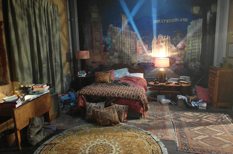 The challenge was enormous because we barely had the budget to fill 2 rooms and Rosemary is the one that is trying to sell that we’re in an entire floor of an old hotel. One of the things that was so challenging, but also was fun in its own way, is that we could only afford to build 2 bedrooms and one corridor. That was all we had, plus one multi-function room that starts as a games room and then is redressed as the bar. And so one of the things that she then did was follow the theme of each room and use the re-dressing to basically turn it into an entirely new character. Once every 3 days.