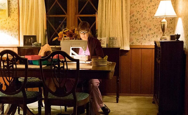 Although saddened and a little hurt that her daughter won’t join them for Thanksgiving, Marion [Laurie Metcalf] tailors her daughter’s new dress...ironically, at the very table where they have always celebrated Thanksgiving...