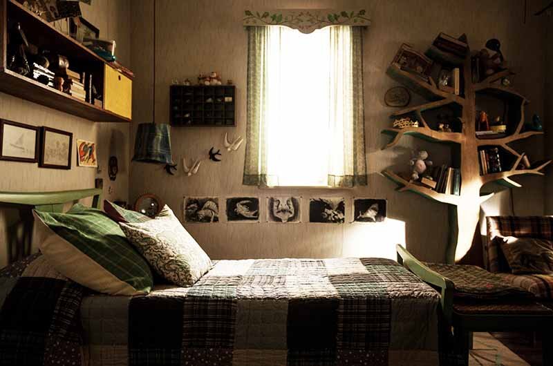 SET DECOR: So many of the set elements are key to symbolic imagery. More subtle than the clock but quietly compelling, is a chest standing just outside that locked room. It’s a soft green with handpainted trees on the front. We see it when Conor tries to peer through the keyhole when the door is locked, and then again when he gets the key to go inside the room, where he and we discover the tree-shaped bookshelves and the images throughout the room, a myriad of moments represented...
